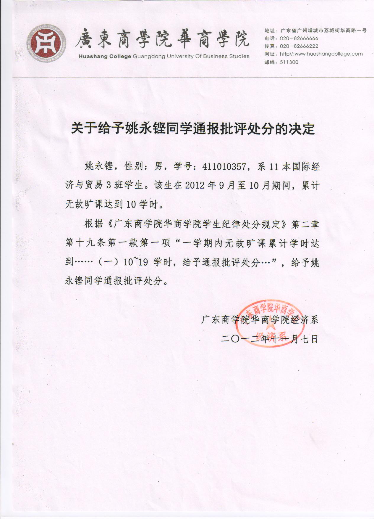 2012-2013学年上学期10月给予黄文杰等五位同学处分公告