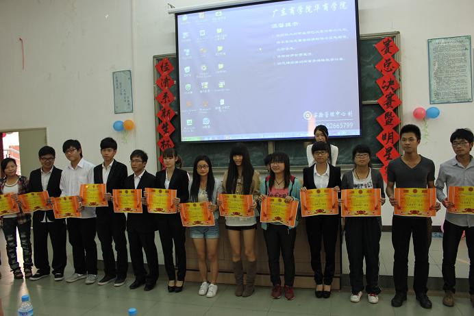 一段回顾视频后,比赛渐渐进入尾声。大赛首先颁发了“新生杯”优秀辩手奖、最佳辩手奖、最具风度奖和最佳人气奖。随后,由院辩论队队长周文庭和院辩论队顾问谢理斌为11国贸1班和2班颁发季军奖,系辩论队顾问徐伟杰为11国贸4班颁发亚军奖。而这届的冠军得主是国贸8班,由系学生会指导老师郭锦荣老师、系辩论队队长罗坚锐为他们颁发奖项。