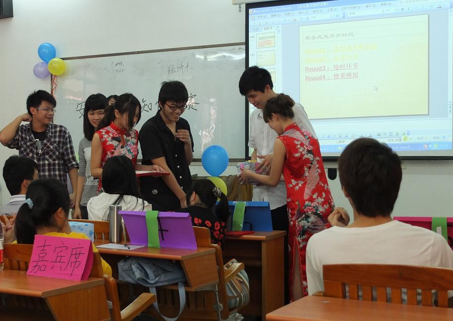 2012年3月20日下午两点半,由经济系学生会学习部与文娱部联合举办的安全教育知识竞赛决赛在创新楼E301举行。到场的嘉宾有:系学生会指导老师郭锦荣老师,11级辅导员黄秋铭和廖小安老师,学生会主席张佳欣、副主席李嘉芙和谢韵婷、常委李汉钊,文娱部部长邓洁雯和方志锋,秘书部部长石锦源。