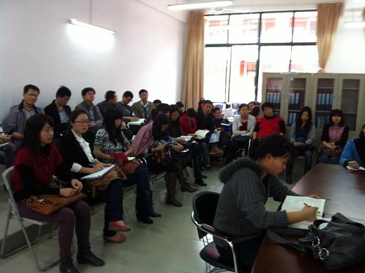 学工助理黄国富老师对学生工作的管理作了一点补充,他指出陈玉川院长要求辅导员能让学生做到:第一,遵纪守法;第二,防止事故发生;第三,保证自身安全。他谈到作为辅导员会督促学生按时上下课,尽量为老师授课提供一个良好的平台,同时也希望老师能够采取一些方法让课堂吸引住学生,例如:1.经常检查学生的到课率,可以数一下到课多少人,然后让班长列出未到课学生的名单交上来,对学生会有一定的威慑力;2.提前20分钟左右到教室,与先到教室的学生谈谈心,增进师生间的沟通与了解;3.上课时可以讲自己或导师、同事成才的励志故事,让学生产生仰慕感,激发他们的上进心;4.避免照本宣科,尽量采取灵活教学法,改进授课技巧,提升学生的听课兴趣。
