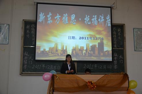 2011年12月6日14时30分,新东方雅思·托福讲座于励志楼A208如期举办。这次有幸邀来了新东方学校国外部的雷妍等三位老师为我们讲授。