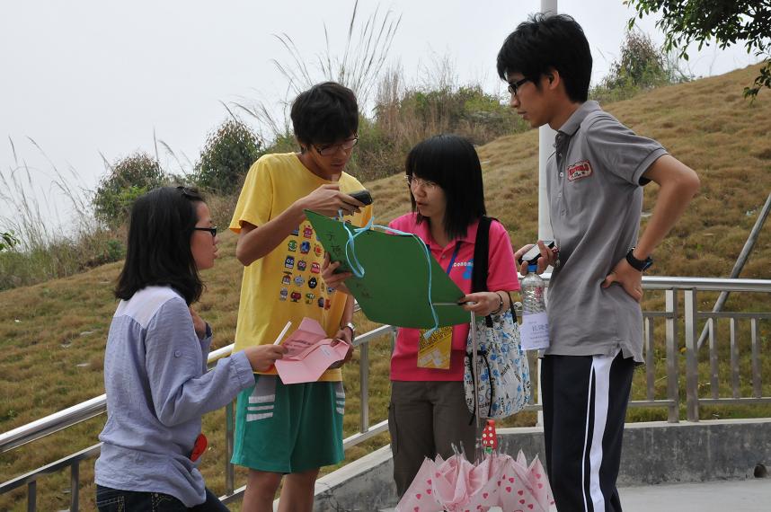 这次的活动吸引了很多同学参加,比赛一共分成了30个小组分别由A1—J3,每一个小组有3个队员。比赛规则就是工作人员分别在学校设下了50个埋伏点,每一队要根据信封中的提示找到其中的8埋伏点,然后解答埋伏点所给出的题目,用时最短、答题准确率的最高队伍就是最后的胜利者。