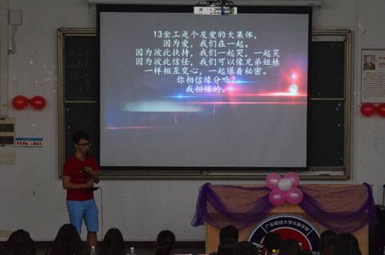 生活就是那么戏剧化,每一秒都在变化。我们在那年夏天相遇、相识,成为了“E家人”。心若没有栖息的地方,到哪里都是在流浪。班级永远是我们未来的几年里最坚实最可靠温暖的信赖与港湾。来自14本国贸3班的小三们在PPT展示中为我们带来了满满的感动,学委和女神的倾情演绎、组委与纪委的“人生不需要解释”,无一不深深印刻在我们的脑海里。很快,第一轮的展示告一段落,系声乐队带来了《他下的夏天》的完美演唱,接着,便是第二轮的展示,14本国商班班级代表的一句“最真实精彩的演讲是用心在演讲”语惊四座,却也获得了掌声一片。在接下来的有奖问答环节,观众答对了问题需要将礼物中的其中一份送给现场的一位异性同学,在那位女同学说出“我愿意”三个字的时候,全场气氛为之沸腾。