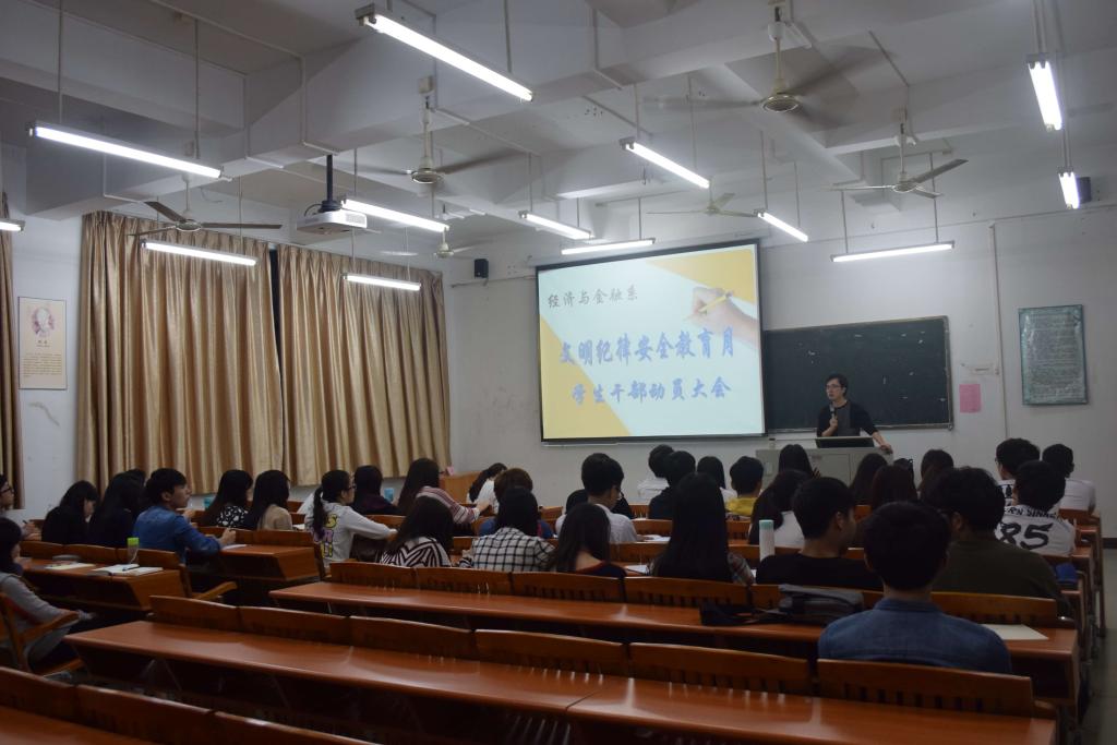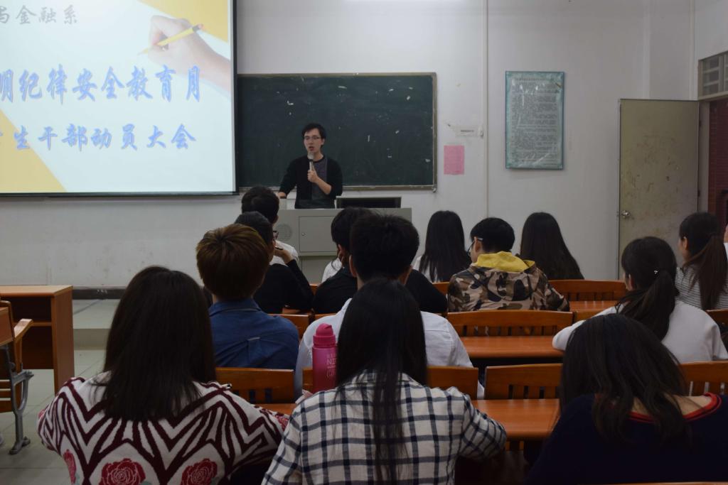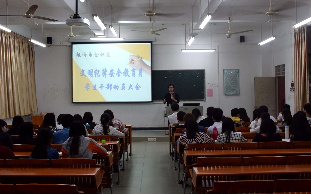 2016年3月31日晚六点二十分,由我们经济与金融系团总支书记宋元跃老师和经济与金融系记者团指导老师类康老师共同主持的“文明纪律安全教育月,学生干部动员大会”会议在励志楼b204举行。