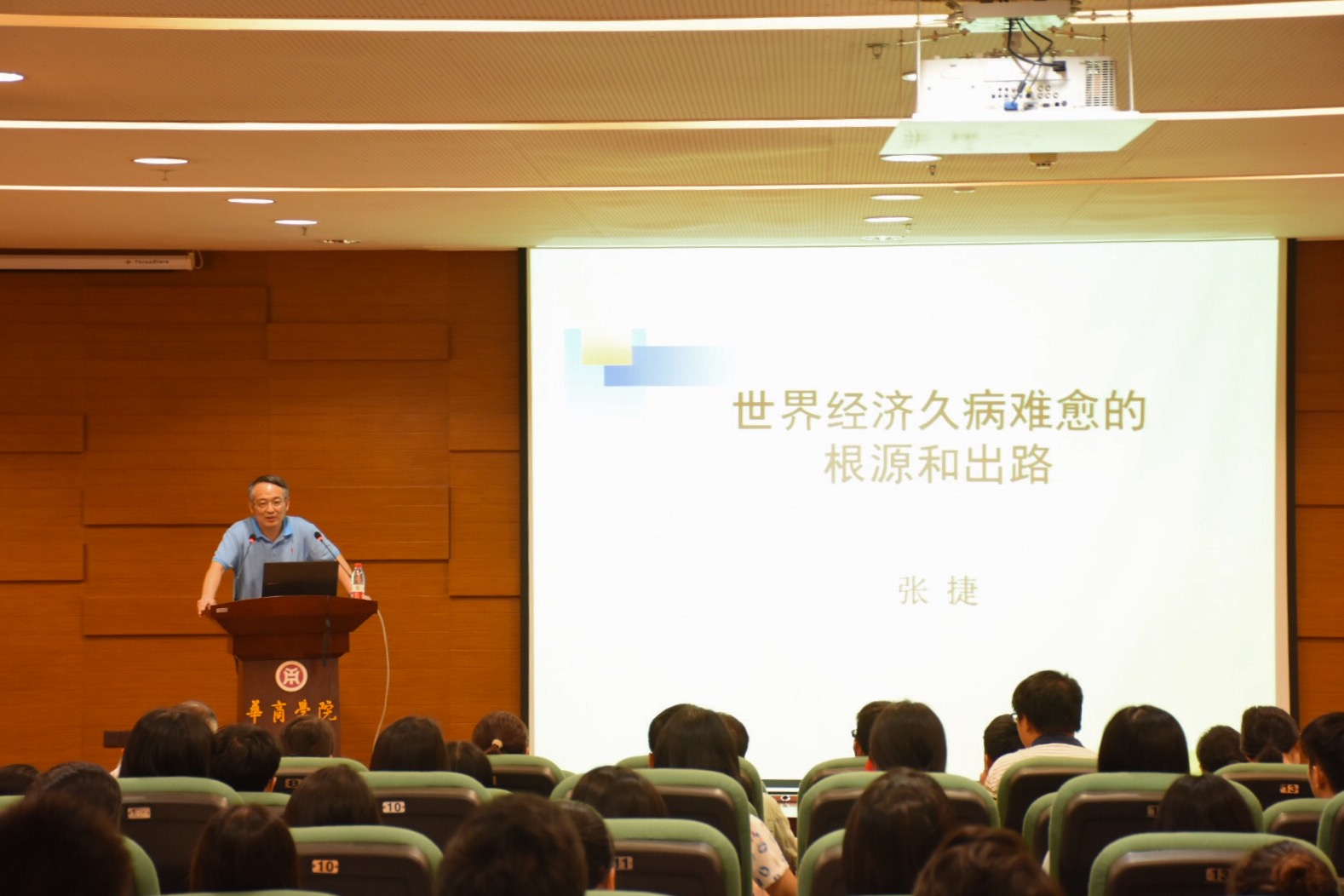2016年9月27日下午15:00,华商经管学院经管论坛第一期主题为世界经济久病难愈的根源及出路讲座于图书馆报告厅开讲。此次讲座由华商学院副院长,经济管理学院院长张捷教授主讲。张捷教授作为经济学博士、博士生导师,暨南大学资源环境与可持续发展研究所所长、广东低碳与可持续发展研究院院长、广东省政府决策咨询顾问。所涉及研究的学术领域包括国际经济、产业经济和环境经济,主持国家社科基金重大项目和重点项目、国家自然科学基金面上项目及重点项目子项目、英国外交部SPF项目和广东省发改委重大项目等;共出版了七部著作,曾在在《经济研究》、《管理世界》、《世界经济》、《国际社会科学杂志》等学术期刊上发表论文上百篇;获得“安子介国际贸易研究奖”优秀著作奖、广东省哲学社会科学优秀成果二等奖、三等奖等。