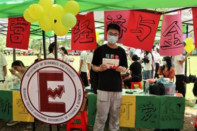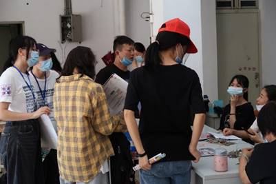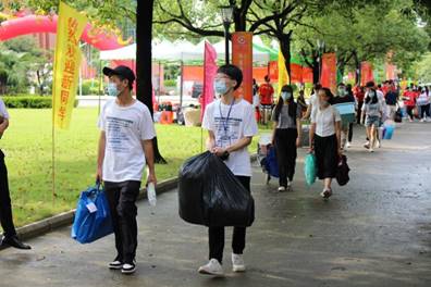 师兄师姐们热情洋溢,来回奔走在宿舍与大本营的路上,他们为新生引路,搬运行李,将华商人的热情传递给每一位远道而来的新生,尽最大可能地为新生提供舒适、便捷、安全的校园环境。阳光热烈,汗珠滴落,然而他们对研途的期待如同这火热的骄阳。