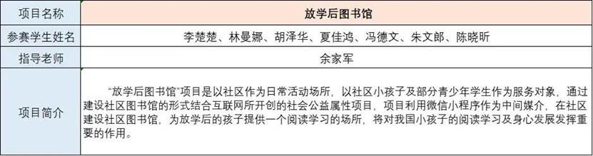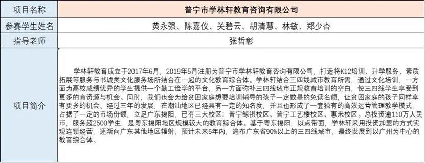在第六届中国国际“互联网+”大学生创新创业大赛校级决赛中,我系参赛队伍中“放学后图书馆”、“普宁市学林轩教育咨询有限公司”两个项目获得“铜奖”,我系也获得了校级颁发的“优秀组织奖”。