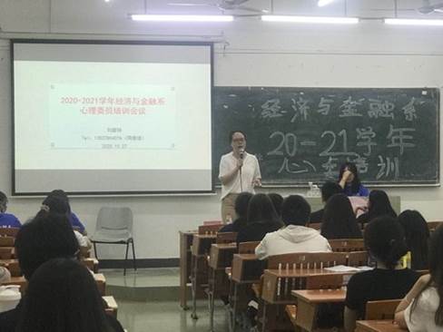 为让经济与金融系心理委员明确心理健康教育工作的重要性以及重视本班学生的心理健康状况, 2020年10月27日在励志楼C301,经济与金融系二级心康站益心园朋辈理事会特此举办2020-2021学年心理委员培训活动。本次培训由经济与金融系益心园指导老师刘甜玲老师讲授,经济与金融系全体心委参与。