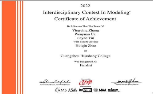 近期,2022年美国大学生数学建模成绩揭晓,我院19金融工程专业张盈盈同学及其参赛团队(指导老师:赵慧琴),于今年2月18日-22日参加美国大学生数学建模竞赛,获得F奖(特等奖提名)。这也是目前我们学校的最好成绩。 美国大学生数学建模竞赛(MCM/ICM),简称“美赛”,由美国数学及其应用联合会主办,是唯一的国际性数学建模竞赛,也是世界范围内最具影响力的数学建模竞赛,迄今已成功举办过30余届。赛题内容涉及经济、管理、环境、资源、生态、医学、安全、等众多领域。参赛队由以1-3 名在校本科生组成,不允许跨校组队,同时配一名指导老师。竞赛要求三人(本科生)为一组,在四天时间内,就指定的问题完成从建立模型、求解、验证到论文撰写的全部工作,体现了参赛选手研究问题、解决方案的能力及团队合作精神,为现今各类数学建模竞赛之鼻祖。 美国大学生数学建模竞赛目前分为两种类型,MCM(Mathematical Contest In Modeling)和 ICM(InterdisciplinaryContest In Modeling),两种类型竞赛采用统一标准进行,竞赛题目出来之后,参数队伍通过美赛官网进行选题,一共分为 6 种题型。其中,MCM下设“连续型”、“离散型”、“大数据”三种题型,ICM下设“运筹学/网络科学”、“环境科学”、“政策”三种题型。获奖比例奖项分为五个层次(由高到低):特等奖(Outstanding Winner:<1 %)、特等奖提名(Finalist:2%)、一等奖(Meritorious:6%)、二等奖(HonourableMetion:22%)、成功参与奖(Successful Participant:66%)。 通过这次数学建模比赛,参赛的同学都表示收获颇多。他们觉得通过比赛不仅锻炼了他们的英文写作能力,而且也提高了团队合作能力和运用所学数学、概率、统计学等课程知识分析解决实际问题的能力。恭喜张盈盈同学及其获奖团队,祝愿OK138太阳集团未来涌现更多优秀的同学取得更好的成绩。