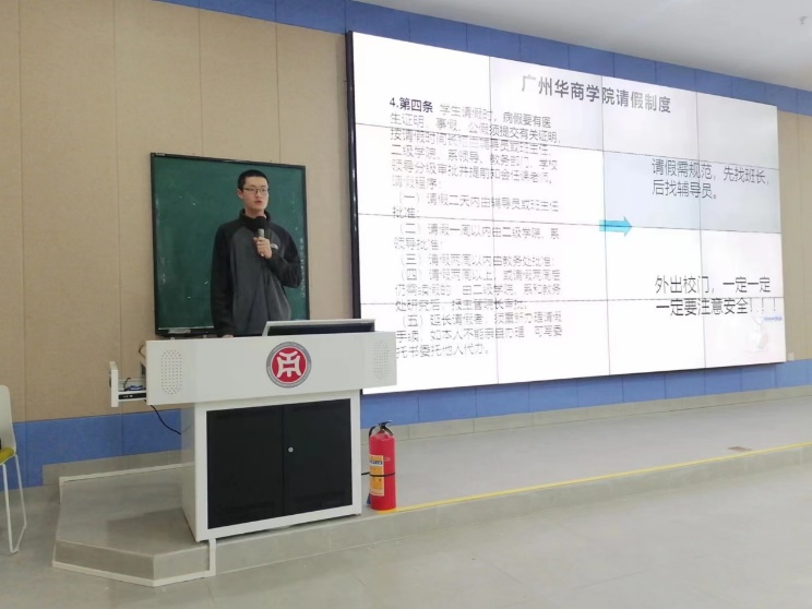经济与金融1班的学生代表率先上台为同学们讲述关于本学期考勤制度和请假制度的变动,详细说明了具体操作流程,并督促同学们遵守规则,配合学生干部工作,共同营造一个更加和谐更加团结的学习氛围。