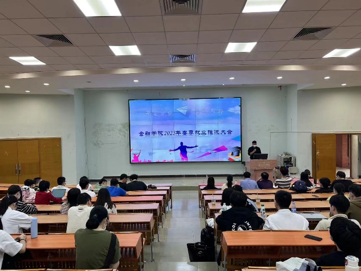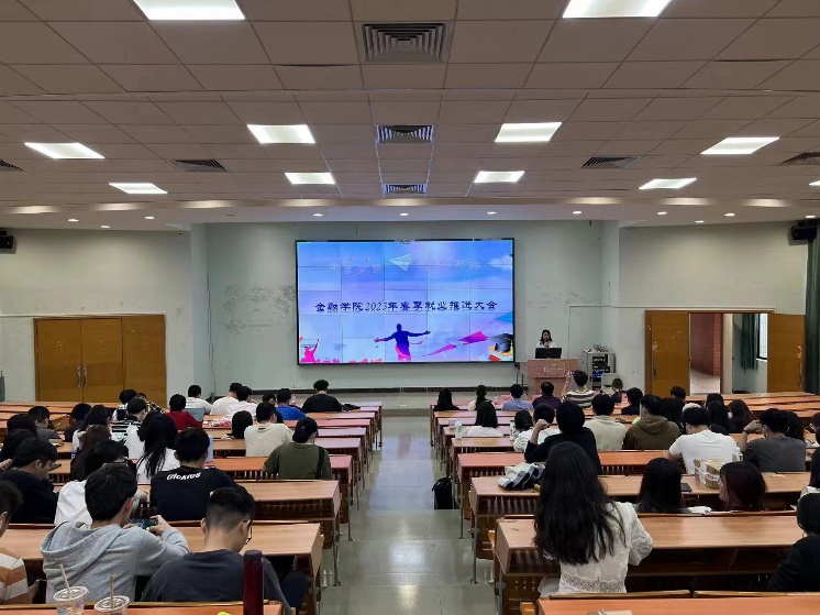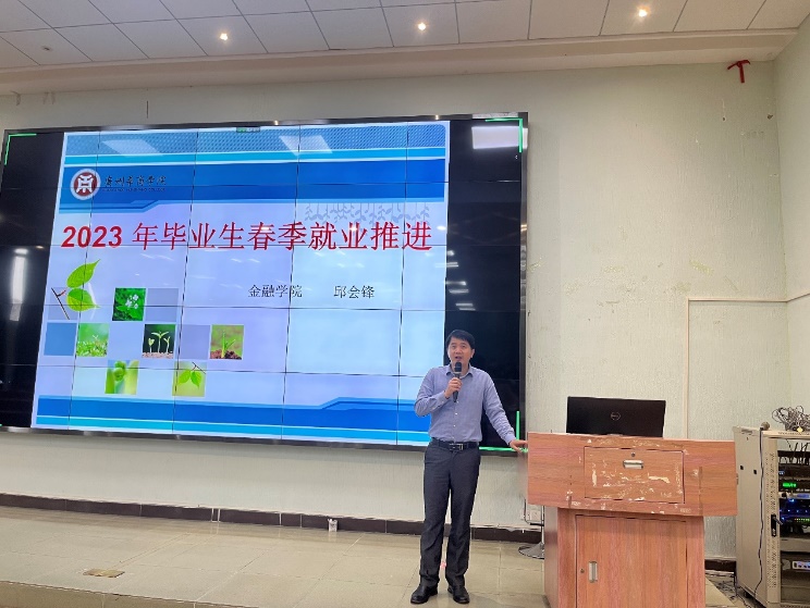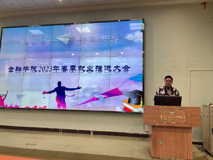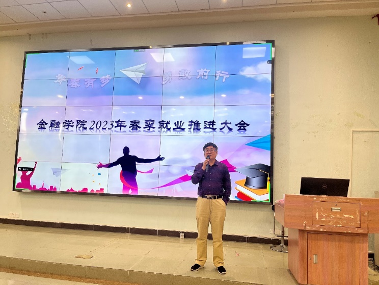 接着,学工办邱会锋主任给毕业生作就业形势分析报告,他以2022届毕业生就业情况以及质量为例,叙述当前金融行业就业前景良好,学校还为此进行开展2023年春季访企拓岗促就业专项行动,因此他希望毕业生们应该调整好心态,积极寻找工作,及时了解就业信息,拓宽就业渠道,把握更多的就业机会,特别是在今年的春招上进行尝试,积累工作经验,最后去实现梦想,而不是逃避就业,怠就业。