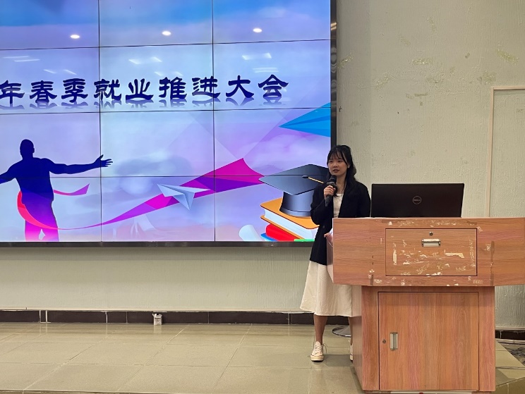 毕业班学生代表王楷煌、丁梓婷上台进行分享,他们结合自己寻找工作的经验、求职经历、简历制作、面试技巧、以及求职过程中遇到的问题进行分享,同学们受益匪浅,最后,他们表达了感谢学校领导老师对他们求职路上的帮助和指导。